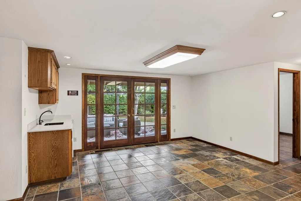 At the end of a private cul-de-sac in the desirable Highlands neighborhood, this ~3,542 square foot home offers a rare blend of space, immense privacy, and natural beauty. The flexible floor plan provides areas to gather, work, and unwind with four bedrooms, an office, and three full bathrooms. Enjoy as is, or reimagine the interiors to meet your individual needs and match your personal style. The main level showcases a living room with vaulted tongue-and-groove ceilings, sunken conversation seating with a natural stone fireplace, a wet bar, and peaceful tree views. The kitchen includes granite countertops, handsome wood cabinetry, and a casual dining area that opens to a pergola-covered patio, perfect for indoor/outdoor living. The lower level provides a family room with doors to the patio, two quiet bedrooms with access to a full bath, and versatile bonus rooms. Upstairs, the expansive primary suite enjoys vaulted wood-beamed ceilings and a cedar-lined walk-in closet, while the adjacent loft-style office has a sitting room and quiet workspace. Outside, the lush, tree-framed grounds create a private retreat with a pool, elevated spa, decks, lawn, and lounge patios. Moments from Foothill Crossing with Trader Joes, commute routes, and highly-acclaimed Cupertino schools.