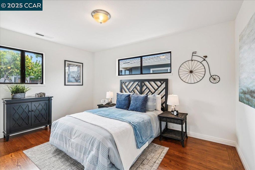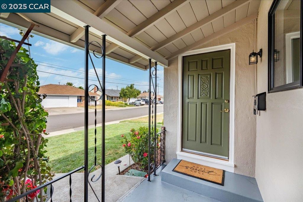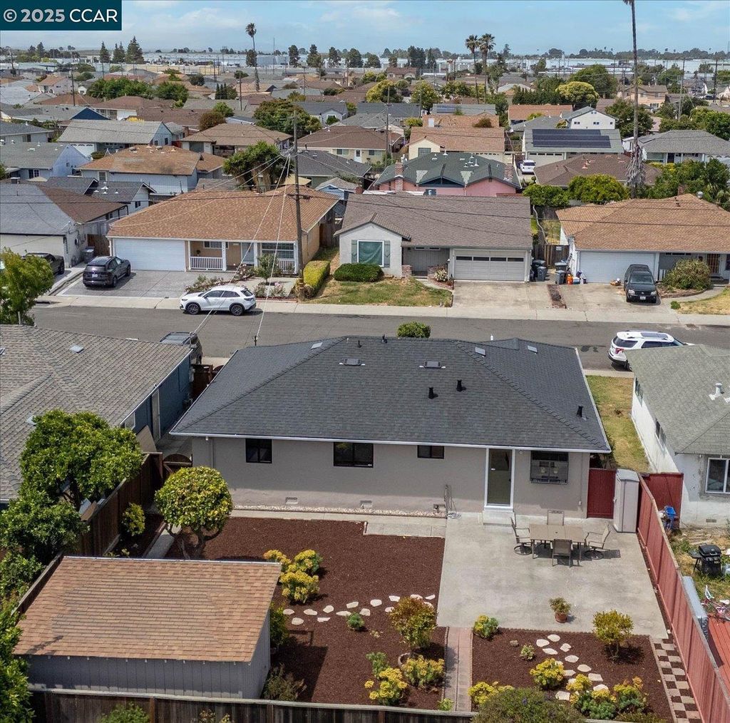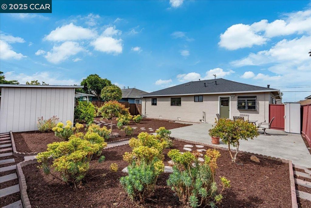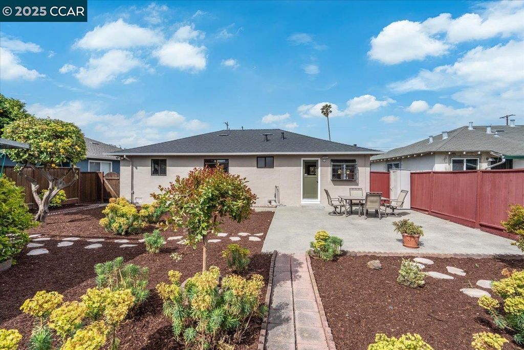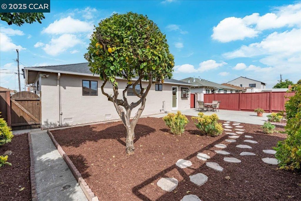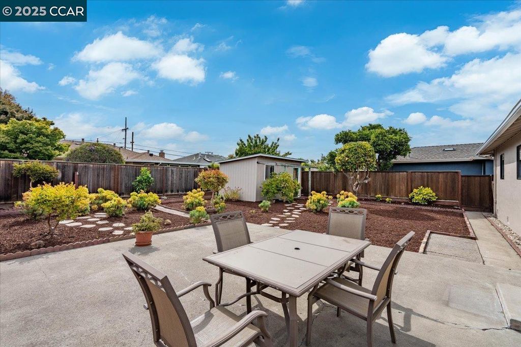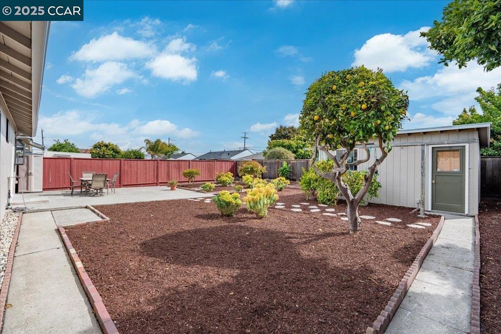 Inviting neighborhood! This AMAZING mid-century three bedroom home in Bonaire Estates, adjacent to Washington Manor, is situated on an approximately 5300 square foot lot offering a detached shed with incredible potential for an ADU! There is an expansive backyard with freshly landscaped gardens, spacious patio, perfect for entertaining, and mature fruit trees - guava, passion fruit, lime and lemon! As you enter this lovely home, you will enjoy a light and airy design with original RED OAK HARDWOOD FLOORING, crown moldings, spacious bedrooms, cedar-lined closets, fresh interior and exterior paint, and an expansive picture window in the living room. A NEW ROOF was installed in 2024, and there is central heating, updated lighting, and an open kitchen with beautifully maintained wood cabinets, gas range, pantry, and NEW QUARTZ COUNTERTOPS! This highly sought after Bonaire neighborhood enjoys a high walk score and is close to several local vibrant eateries, great schools, Bay Fair Mall, 880/580/238 freeways, Kaiser Hospital, Washington Manor Park, Bonaire Park, local Library branch, BART, and picturesque San Leandro Marina! Truly a MUST SEE!