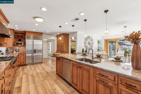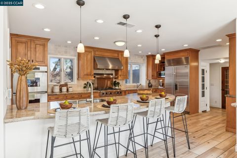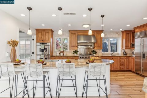 GREAT NEW PRICE! Perched above the treetops in sought-after Westside Alamo, this private hilltop retreat offers breathtaking views, unmatched serenity, and timeless California elegance. Set on nearly 2 acres, the main residence features 4 bedrooms, 3.5 baths, and over 3,200 square feet of sunlit living. The chef's kitchen with premium appliances opens seamlessly to a view-filled dining room with fireplace - perfect for entertaining or quiet evenings in. A dramatic two-story primary suite creates a true sanctuary with its own living room, private deck, and panoramic vistas of Las Trampas Ridge. Three additional bedrooms, including a junior ensuite, are ideally positioned for privacy. The 1,300-bottle wine cellar, guest cottage with kitchenette and full bath, and resort-style pool complete the experience. Wood-look tile floors offer style and durability, while lush, oak-draped grounds bloom with year-round color. Just minutes from downtown Danville, Walnut Creek, top-rated schools and commute routes, this rare offering is a perfect blend of natural beauty and convenience. Come experience the view - and the lifestyle.