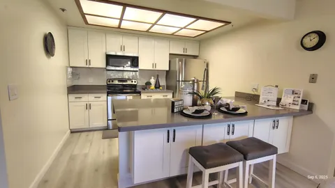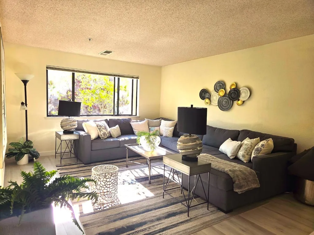 Stunning and LARGEST unit you will find in this community. It's SPACIOUS 1456 sf. This ONE STORY unit in GATED community is the perfect ROOMMATE FLOORPLAN (privacy minded bed & bath / shared kitchen & family area). Fabulous sought after OPEN CONCEPT allows interaction from remodeled beautiful kitchen to convenient family space & dining area. BREAKFAST NOOK is welcome feature for mom as well as young kids. Upgraded HARD FLOOR offers clean look and convenience. Large windows create NATURAL LIGHT and spacious BALCONY offers views of landscaping & trees with the joy of the singing birds. Two BIG BEDROOMs offer enough space for OFFICE USE as well as FAMILY ACTIVITIES. Primary bath has dual sinks, large closet & bathtub / shower. Second bedroom is also equally spacious with BAY WINDOW & WALK-IN CLOSET. Guest bath has large soaking tub. Your family will enjoy MORNING BRIGHT SUN and afternoon fresh cool air. [More] IN HOUSE FULL-SIZE WASHER & DRYER, Refrigerator, storage closet, elevator, 2 parking spaces. HOA covers a tons - swimming pool, hot tub, sauna, rec room with ping pong & pool table. Easy commute to Silicon Valley major tech campus Apple, Nvidia, Google and even 49's Levi's stadium. Motivated seller will consider any reasonable offer.