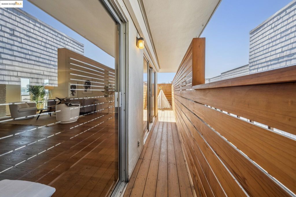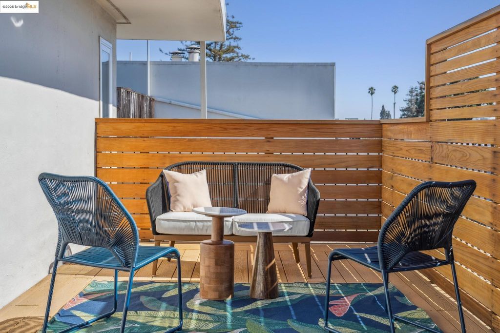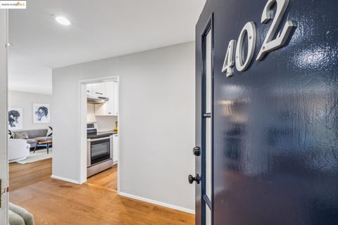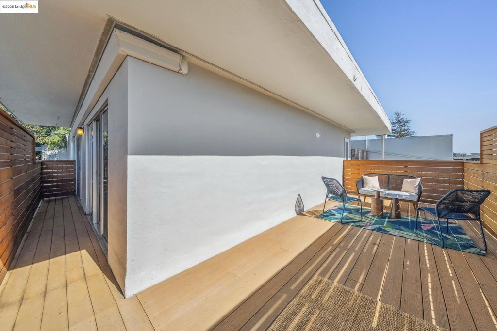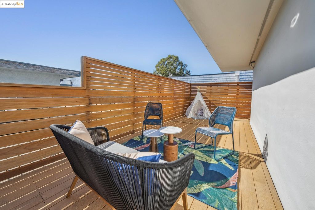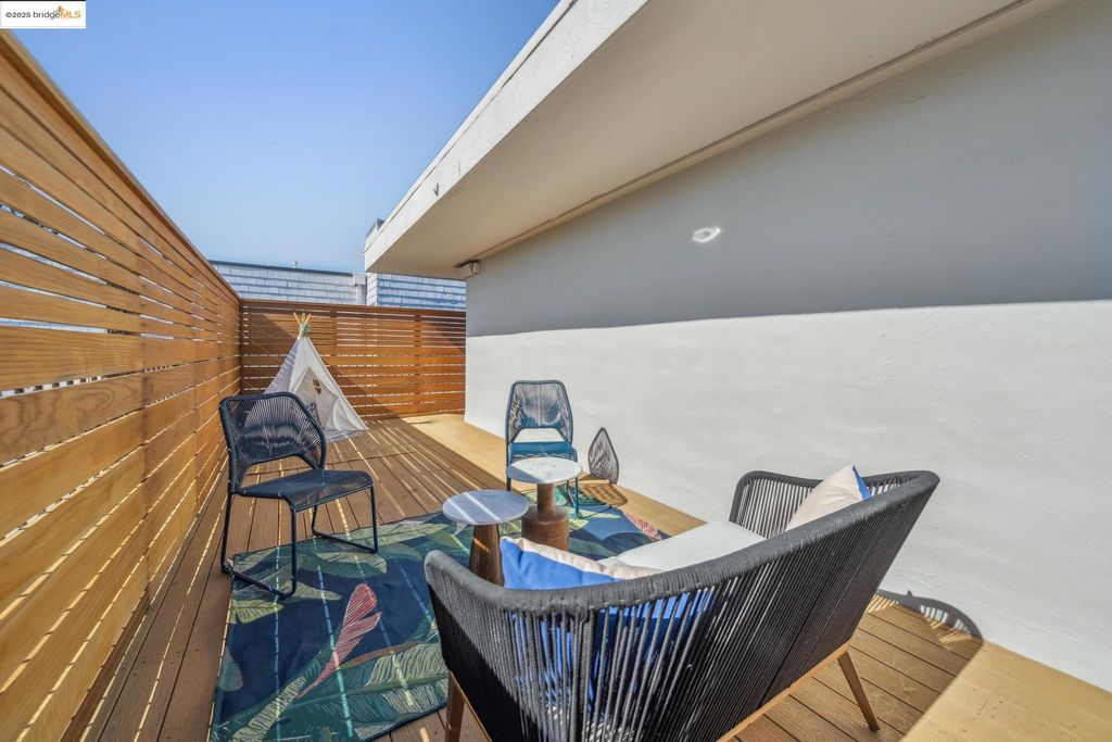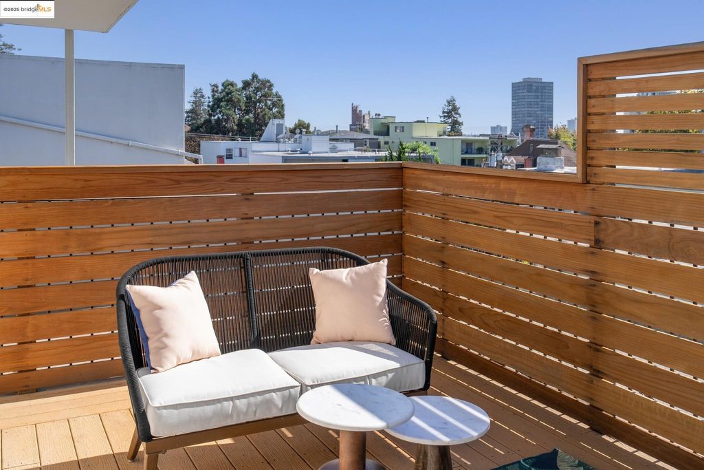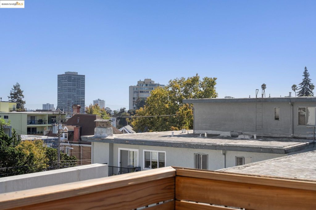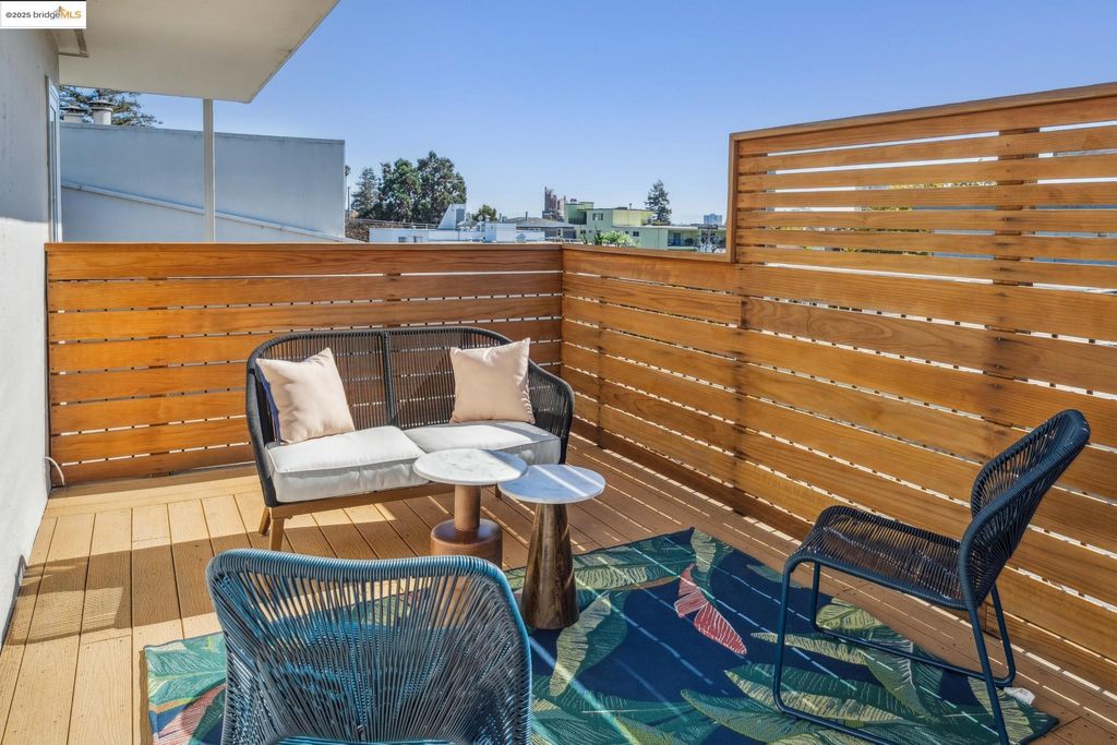 Welcome to the Penthouse. This refined residence offers an exceptional blend of sophisticated design, expansive living spaces, & modern finishes, all just blocks from Lake Merritt. Thoughtfully remodeled, the kitchen pairs sleek modern updates with the timeless warmth of natural oak floors that flow throughout the home. The generous living room, complete with a charming brick fireplace, creates a welcoming centerpiece. An elegant dining area, accented by striking modern lighting, provides the perfect setting for gatherings large or small. The crown jewel of this home is its expansive penthouse rooftop deck, encircled by a custom redwood fence that ensures both privacy and style; an ideal space for al fresco entertaining, while taking in neighborhood views. The oversized primary bedroom is equipped with en-suite half-bath and walk-in-closet. Additionally, the oversized second bedroom boasts multiple double slider closets. Both bathrooms feature modern vanities, lighting, and mirrors. Skylights throughout bathe this penthouse unit in abundant natural light. Convenience is woven into the design, with additional ample closets off the foyer for organized storage. Close to all the restaurants & shops along Grand and Lakeshore. Blocks from Whole Foods & access to nearby I-580.