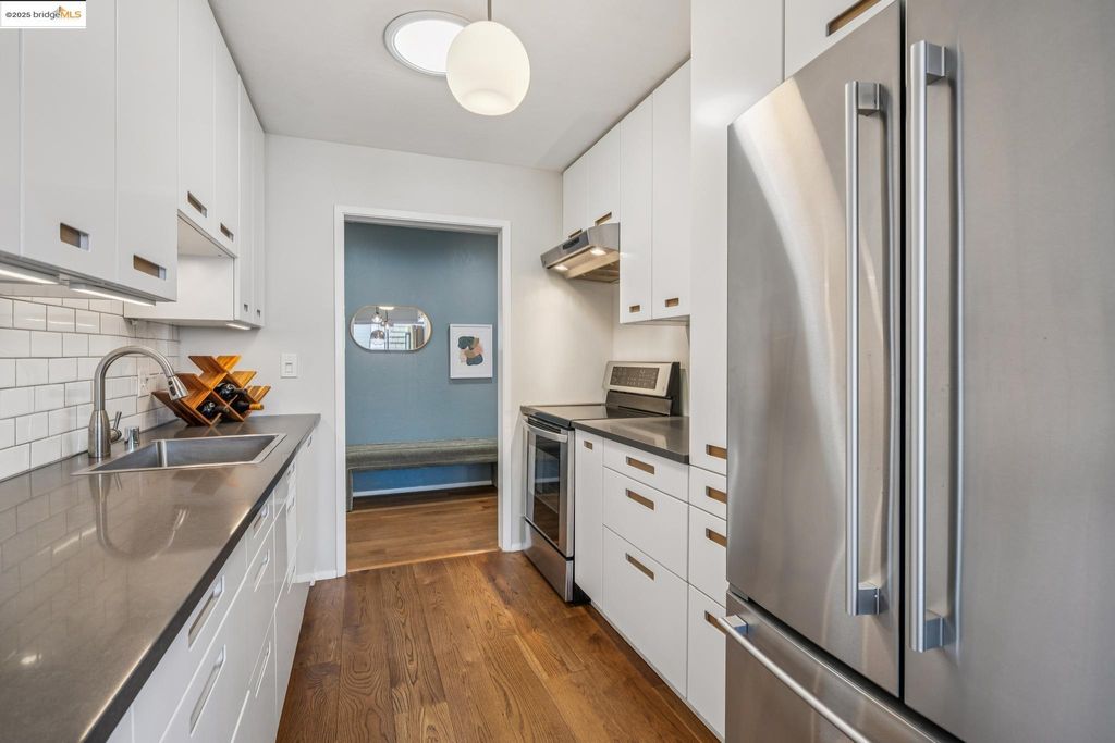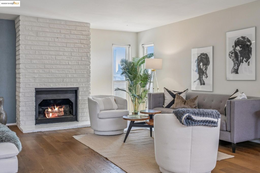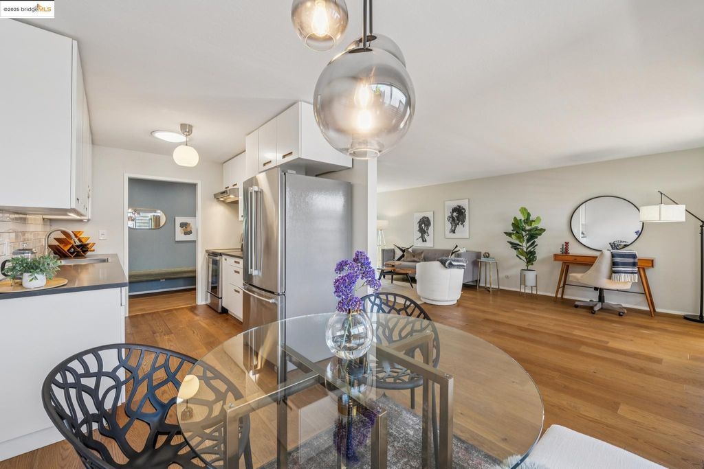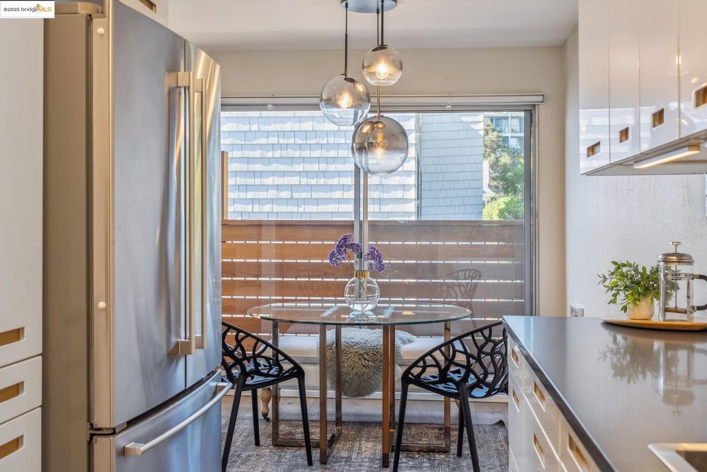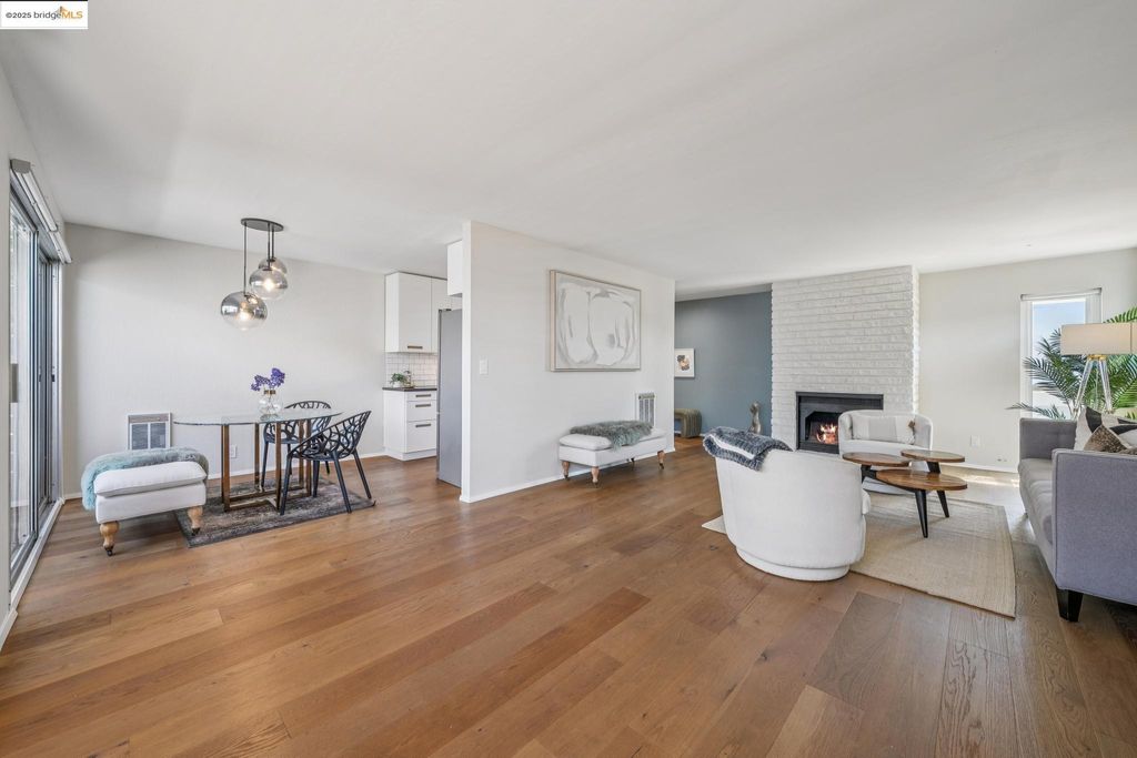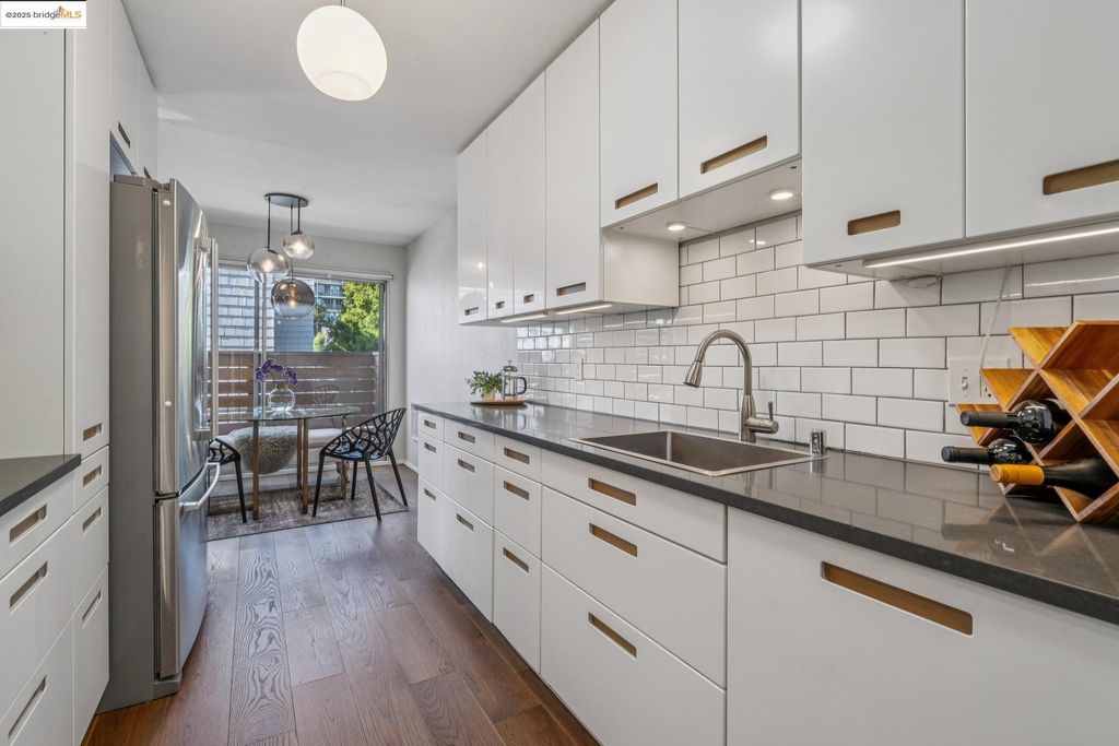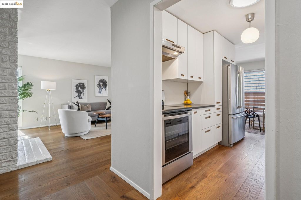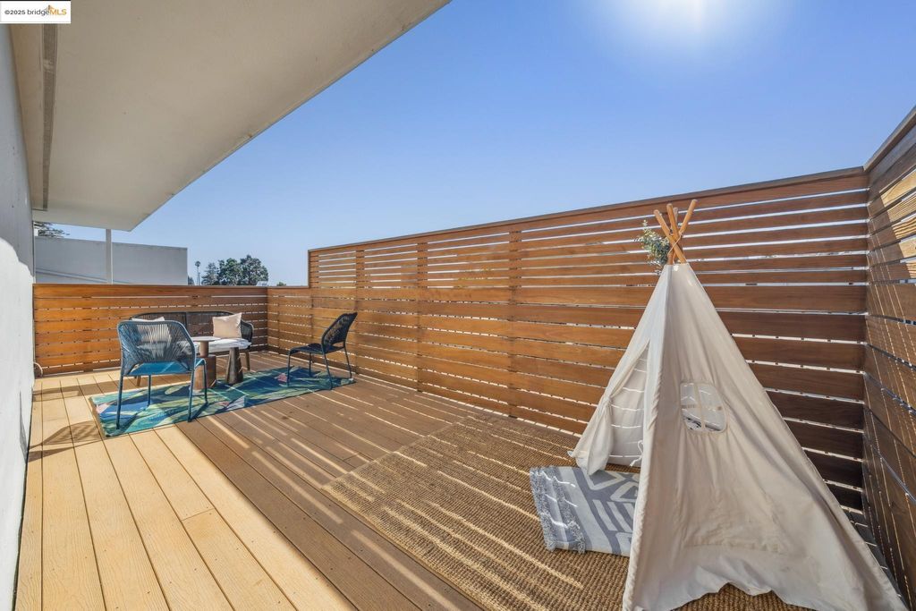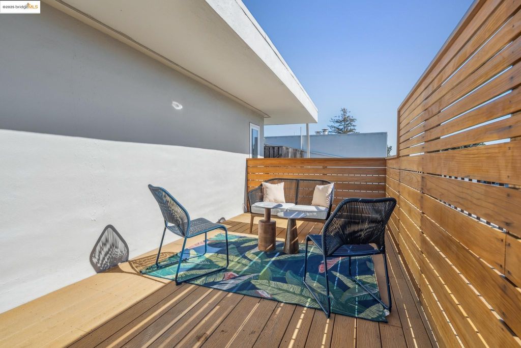 Welcome to the Penthouse. This refined residence offers an exceptional blend of sophisticated design, expansive living spaces, & modern finishes, all just blocks from Lake Merritt. Thoughtfully remodeled, the kitchen pairs sleek modern updates with the timeless warmth of natural oak floors that flow throughout the home. The generous living room, complete with a charming brick fireplace, creates a welcoming centerpiece. An elegant dining area, accented by striking modern lighting, provides the perfect setting for gatherings large or small. The crown jewel of this home is its expansive penthouse rooftop deck, encircled by a custom redwood fence that ensures both privacy and style; an ideal space for al fresco entertaining, while taking in neighborhood views. The oversized primary bedroom is equipped with en-suite half-bath and walk-in-closet. Additionally, the oversized second bedroom boasts multiple double slider closets. Both bathrooms feature modern vanities, lighting, and mirrors. Skylights throughout bathe this penthouse unit in abundant natural light. Convenience is woven into the design, with additional ample closets off the foyer for organized storage. Close to all the restaurants & shops along Grand and Lakeshore. Blocks from Whole Foods & access to nearby I-580.