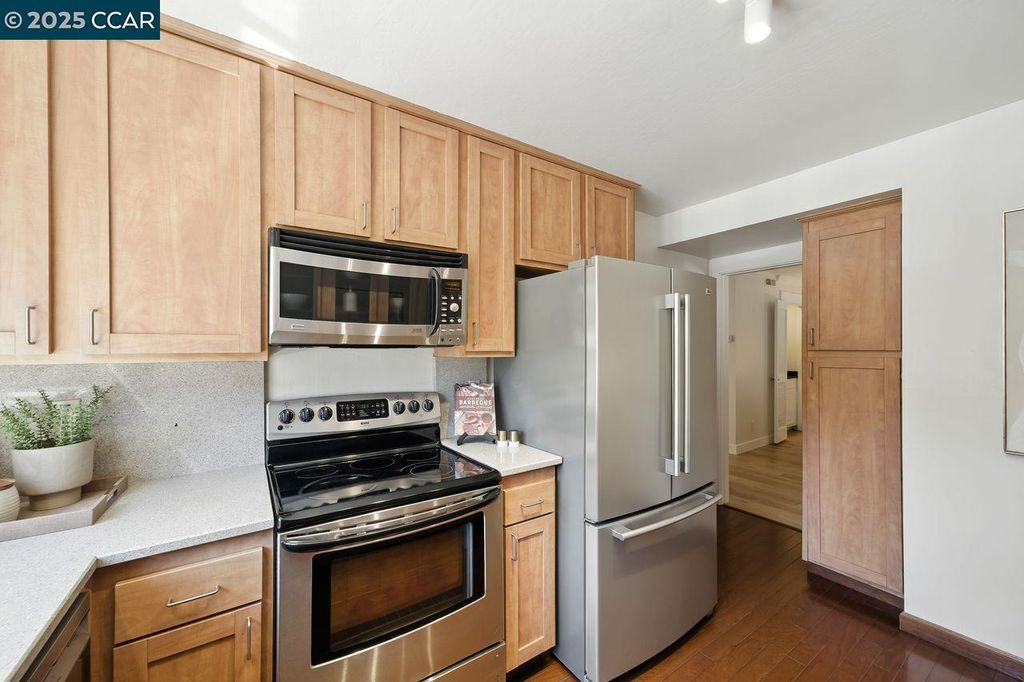 Do you dream of starting your day stepping out your front door to enjoy the perfect cup of coffee, warm freshly glazed donuts from the iconic Colonial Donuts & a stroll around the famous Lake Merritt? This extensively upgraded corner end-unit condo, peacefully situated at the back of a small, intimate 15-unit building at the intersection of Trestle Glen & Wesley, makes that dream a reality! With 1,300 sq ft, more than many single-family homes, you'll enjoy a spacious, maintenance-free lifestyle w/an elevator & underground garage. The desirable floor plan, w/newly installed laminate plank flooring, offers a great distribution of rooms w/a wealth of windows filling each space w/natural light. The generous deck lets you unwind at day's end or host friends before dinner in the adjacent dining room. The convenient kitchen features glass-front cabinets & a pantry for added storage. Retreat to the primary suite w/its walk-in closet w/organizers, dual vanity & illuminated mirrors. The second bedroom also offers impressive size & a generous closet. The updated hall bath includes a stackable w/d. Experience the best of neighborhood living w/evenings at Bardo, Saturday Farmer's Market, Arizmendi pizza, Grand Lake Theater, Trader Joe's - come for the beauty, stay for the convenience!