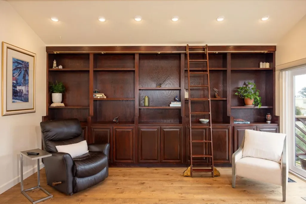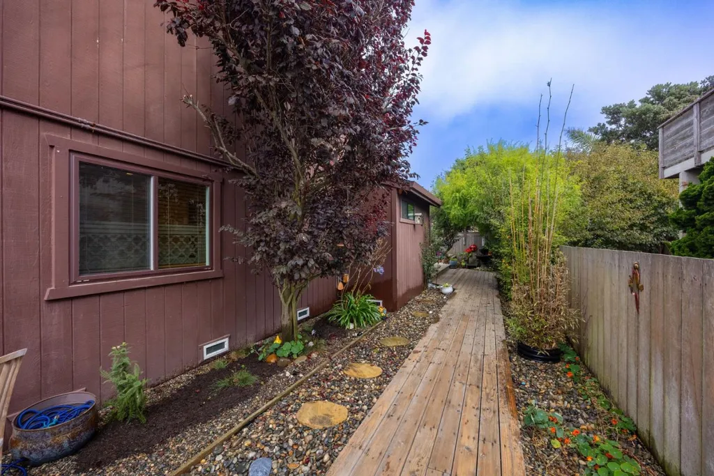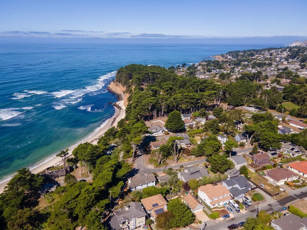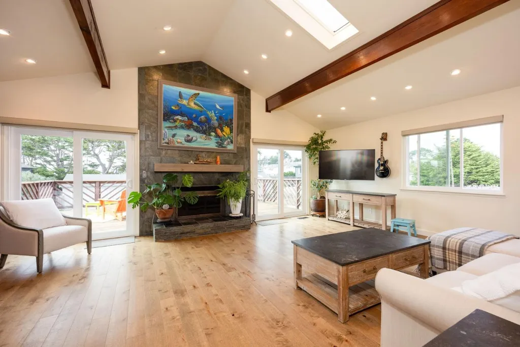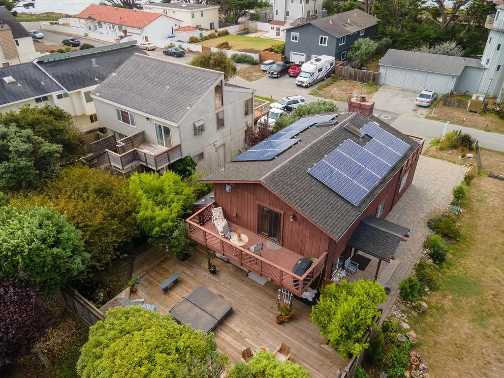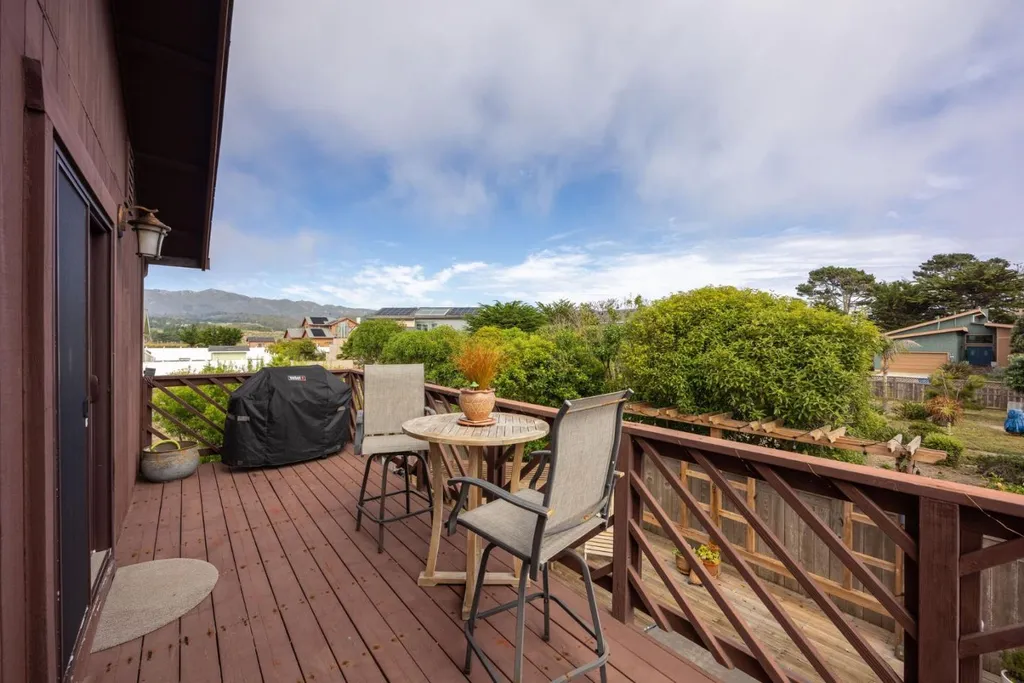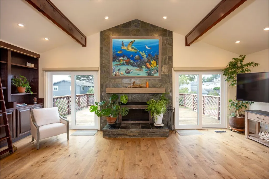 Where ocean sunsets meet everyday comfort-Seal Cove living at its best. Welcome to this updated 1720 sq ft, 3 bed/3 bath home in Moss Beach's Seal Cove. All three bedrooms are located on the ground floor, including a primary suite with French doors opening directly to the spa patio and a spacious stone walk-in shower. Two full bedrooms serve the bedroom level, while a third full bathroom upstairs adds convenience for guests. The upstairs living spaces are filled with natural light, including vaulted ceilings, skylights, a dramatic slate fireplace, and custom built-ins with a rolling library ladder. From here, step out to the expansive front deck with ocean views or retreat to the back deck overlooking the gardens for BBQ's or morning coffee. Practical upgrades include a newer furnace, water heater, and water filtration system. An attached 2-car garage with laundry adds convenience. Located within the Cabrillo Unified Elementary School District, don't miss this beautifully updated home with ocean and mountain views in Moss Beach.
