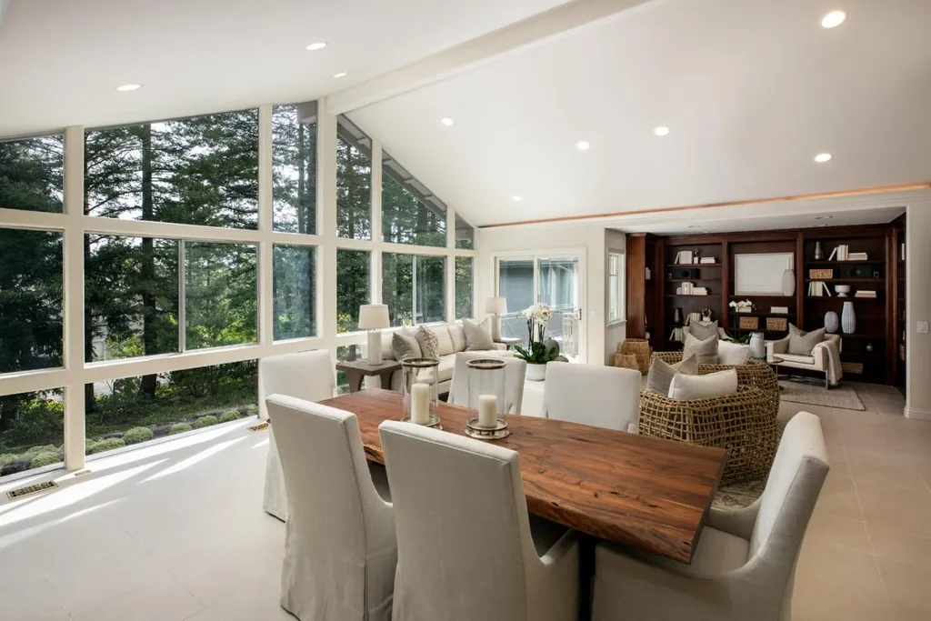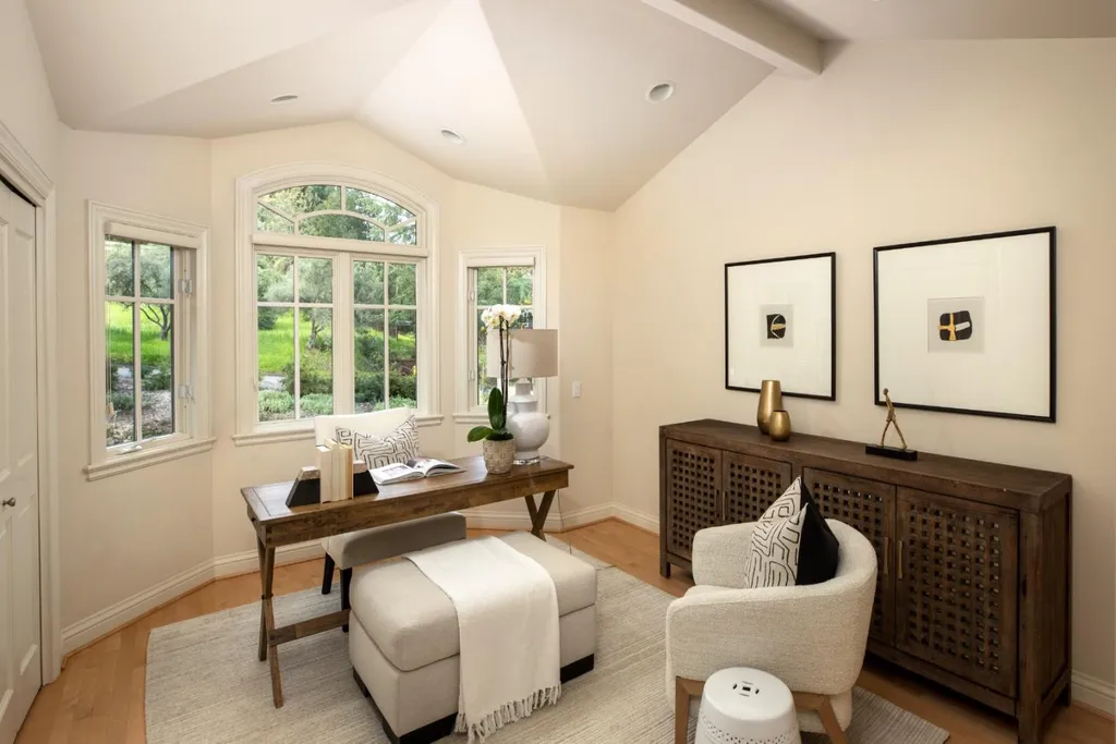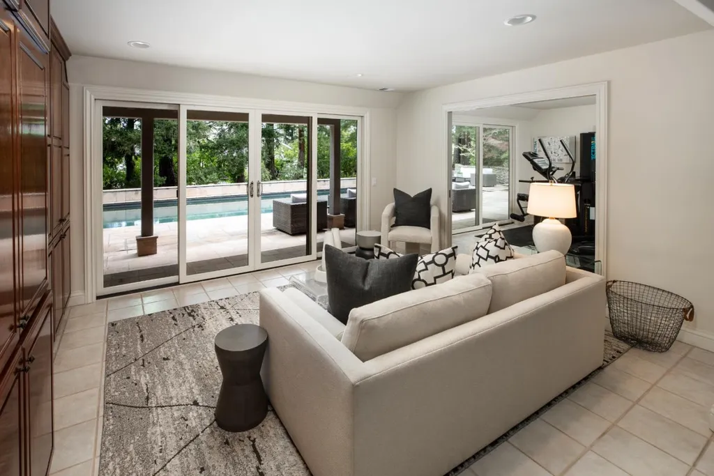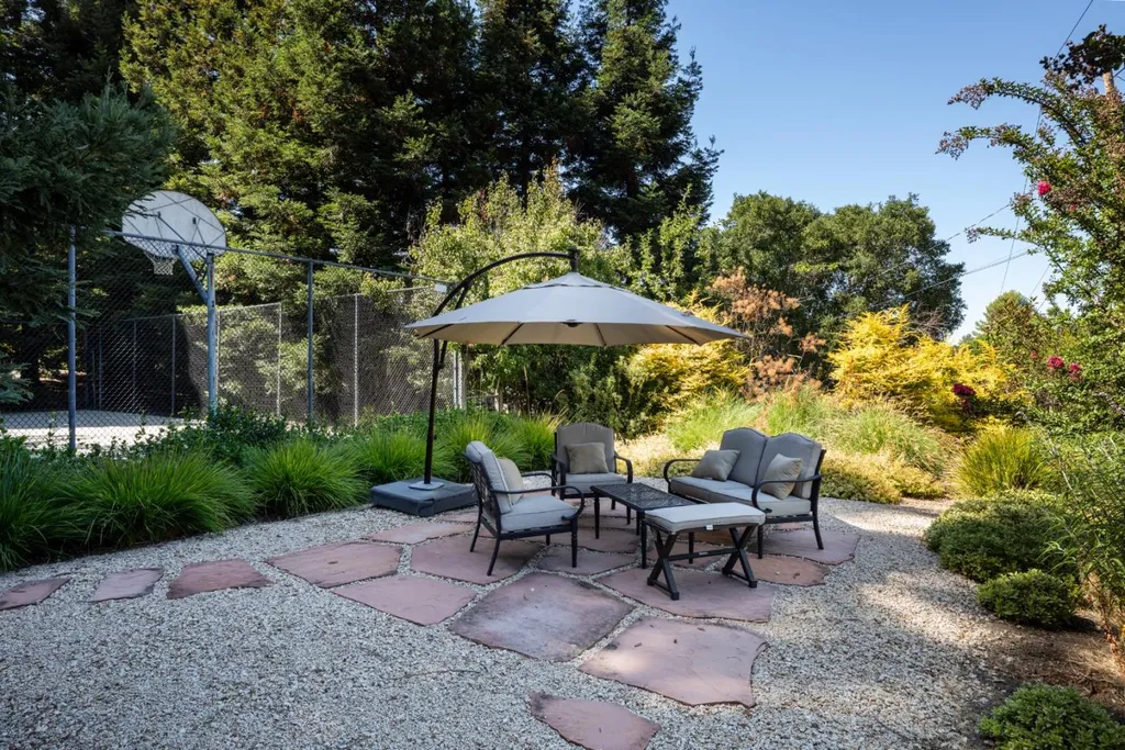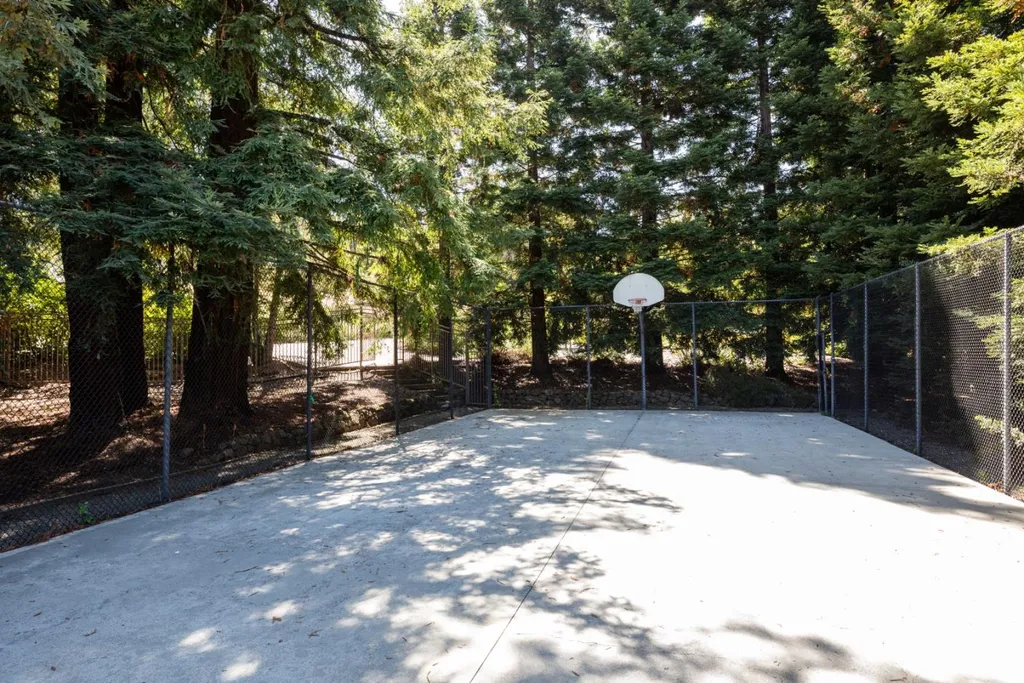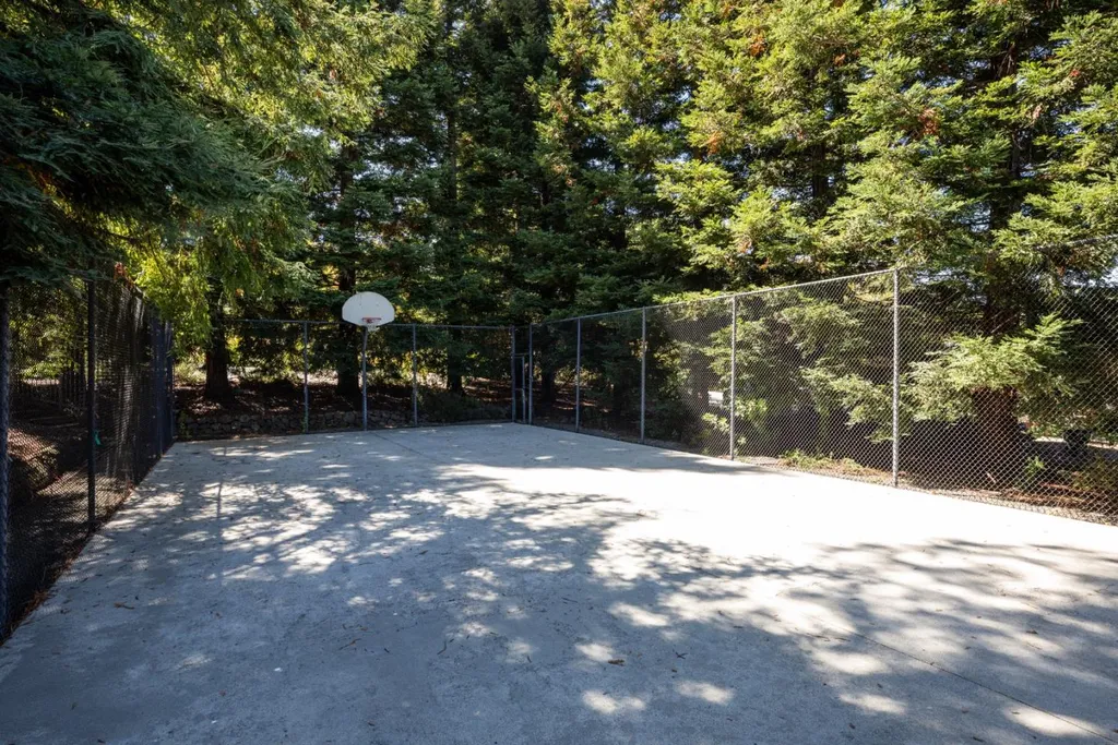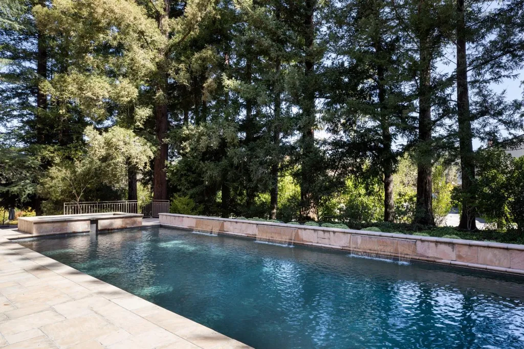 This beautifully appointed resort-like home, with 6 bedrooms, office, and 6.5 baths, is positioned on one acre of private grounds. Tiled and maple floors enhance the spacious interiors, which begin with a dramatic living and dining room with soaring wall of glass rising to the cathedral ceiling, a library area, and fireplace. The gourmet kitchen with granite counters and high-end appliances opens to the family room with a fireplace and numerous sliding glass doors open to rear balconies with stairs down to the pool. The main level comprises the primary suite with fireplace, an additional suite, two bedrooms that share a bath, plus a bedroom and bath privately located near the family room. The lower level offers a bedroom suite, customized office, recreation room with refreshment bar, and fitness center, each with outside access. There is a sunswept pool and spa, tucked away large fenced sport court, beautiful redwood groves, and a sunny side yard with vegetable beds. Top Palo Alto schools complete this exceptional solar-powered home.