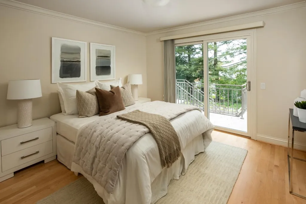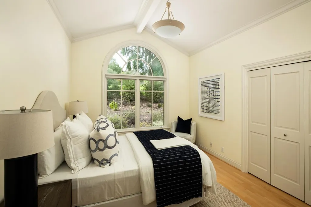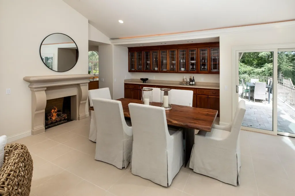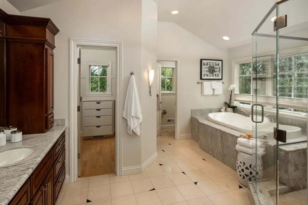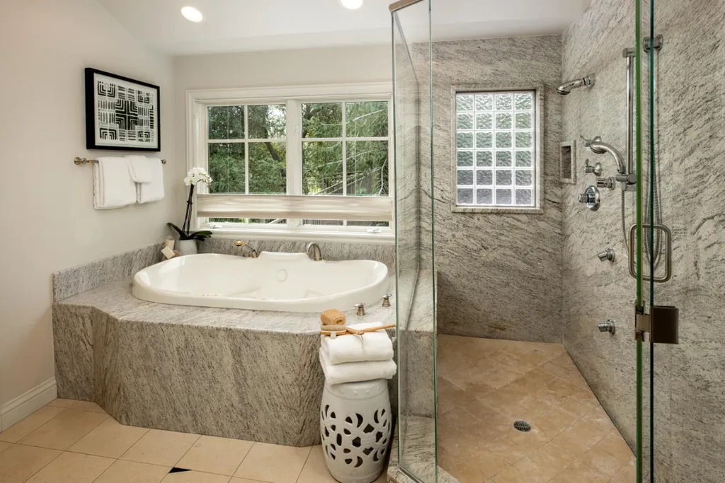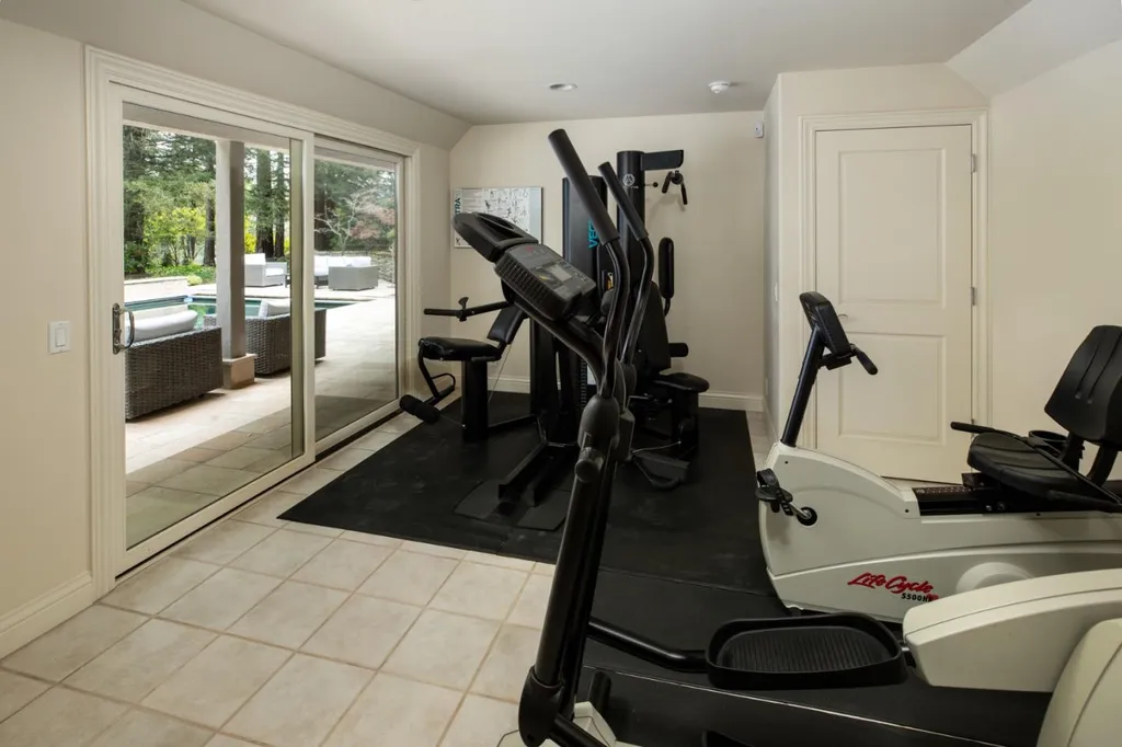 This beautifully appointed resort-like home, with 6 bedrooms, office, and 6.5 baths, is positioned on one acre of private grounds. Tiled and maple floors enhance the spacious interiors, which begin with a dramatic living and dining room with soaring wall of glass rising to the cathedral ceiling, a library area, and fireplace. The gourmet kitchen with granite counters and high-end appliances opens to the family room with a fireplace and numerous sliding glass doors open to rear balconies with stairs down to the pool. The main level comprises the primary suite with fireplace, an additional suite, two bedrooms that share a bath, plus a bedroom and bath privately located near the family room. The lower level offers a bedroom suite, customized office, recreation room with refreshment bar, and fitness center, each with outside access. There is a sunswept pool and spa, tucked away large fenced sport court, beautiful redwood groves, and a sunny side yard with vegetable beds. Top Palo Alto schools complete this exceptional solar-powered home.