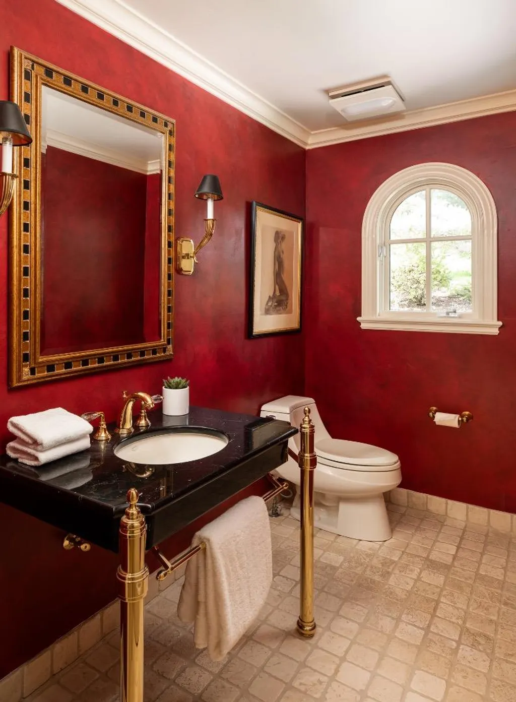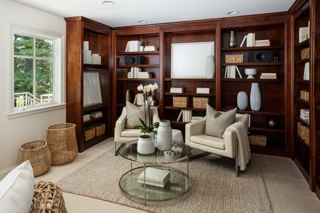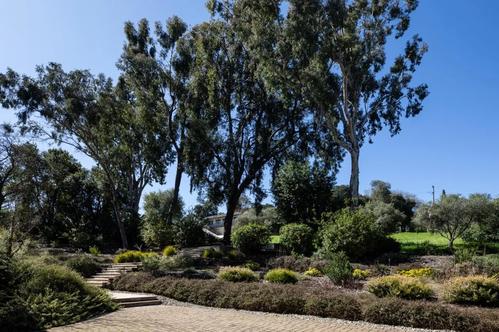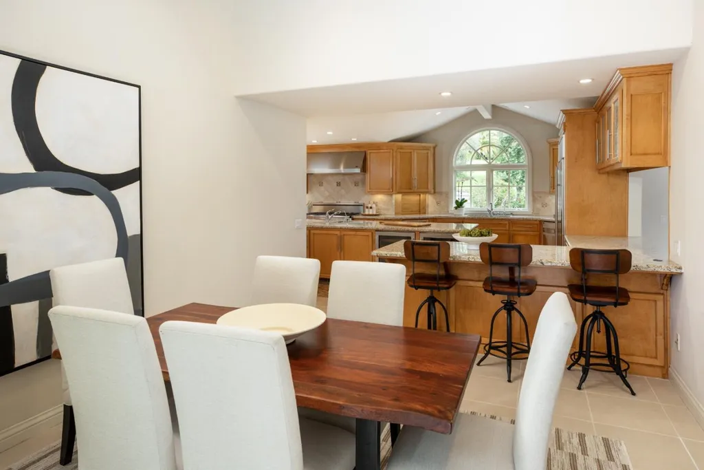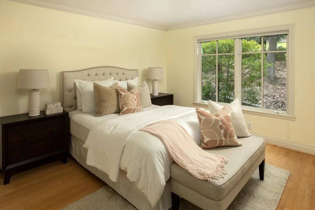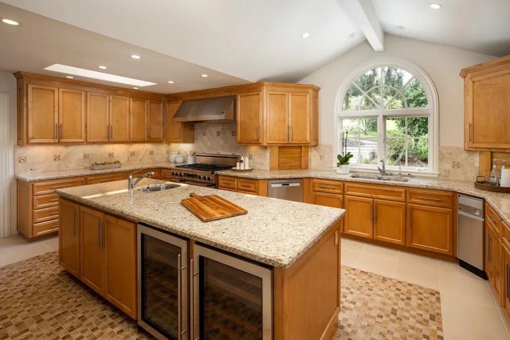 This beautifully appointed resort-like home, with 6 bedrooms, office, and 6.5 baths, is positioned on one acre of private grounds. Tiled and maple floors enhance the spacious interiors, which begin with a dramatic living and dining room with soaring wall of glass rising to the cathedral ceiling, a library area, and fireplace. The gourmet kitchen with granite counters and high-end appliances opens to the family room with a fireplace and numerous sliding glass doors open to rear balconies with stairs down to the pool. The main level comprises the primary suite with fireplace, an additional suite, two bedrooms that share a bath, plus a bedroom and bath privately located near the family room. The lower level offers a bedroom suite, customized office, recreation room with refreshment bar, and fitness center, each with outside access. There is a sunswept pool and spa, tucked away large fenced sport court, beautiful redwood groves, and a sunny side yard with vegetable beds. Top Palo Alto schools complete this exceptional solar-powered home.