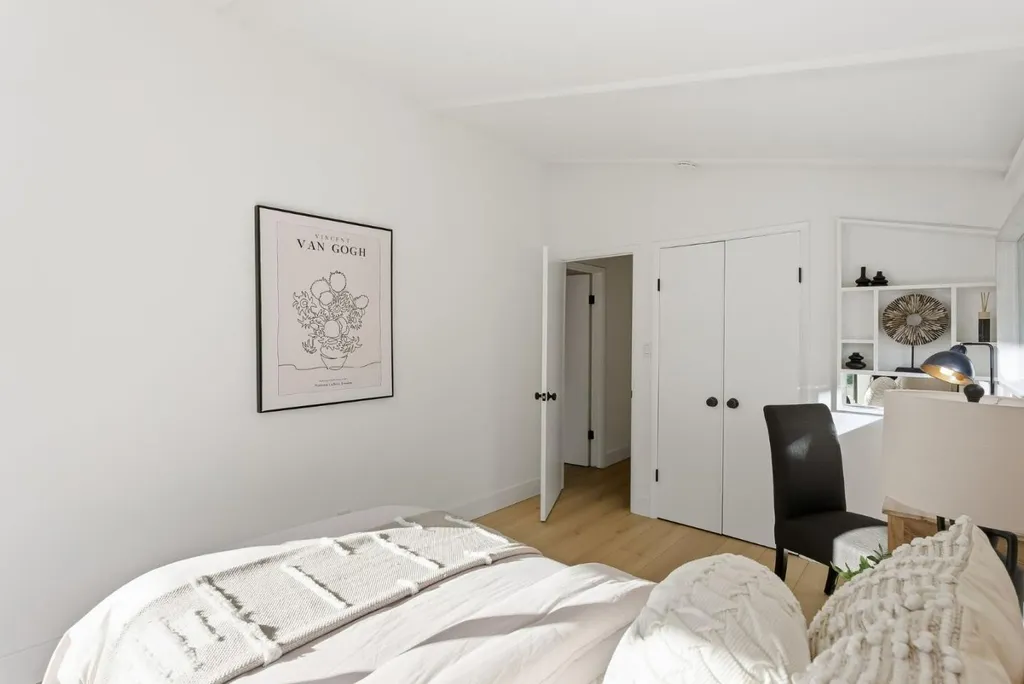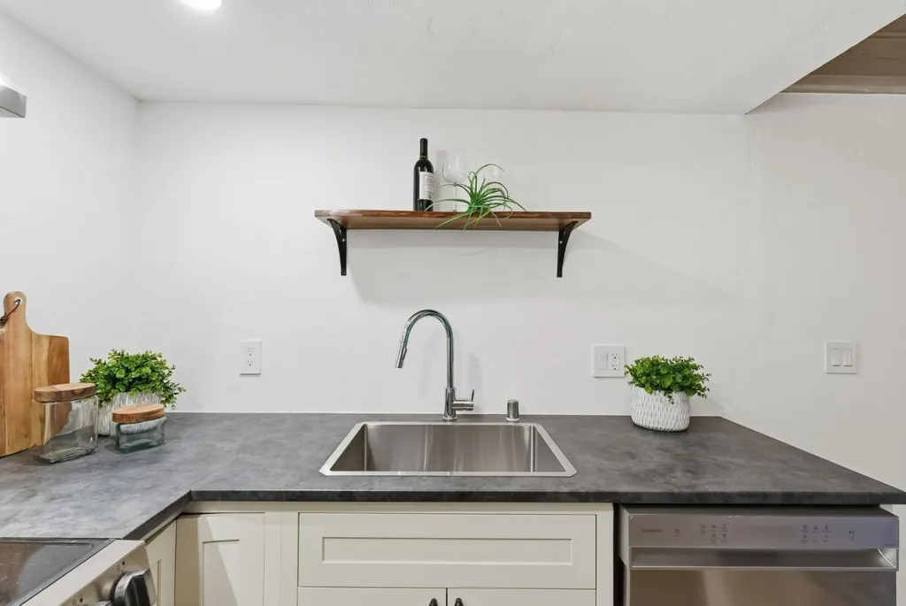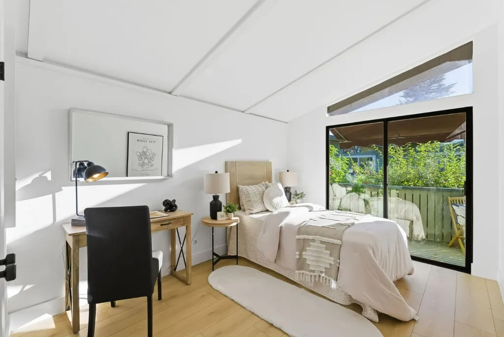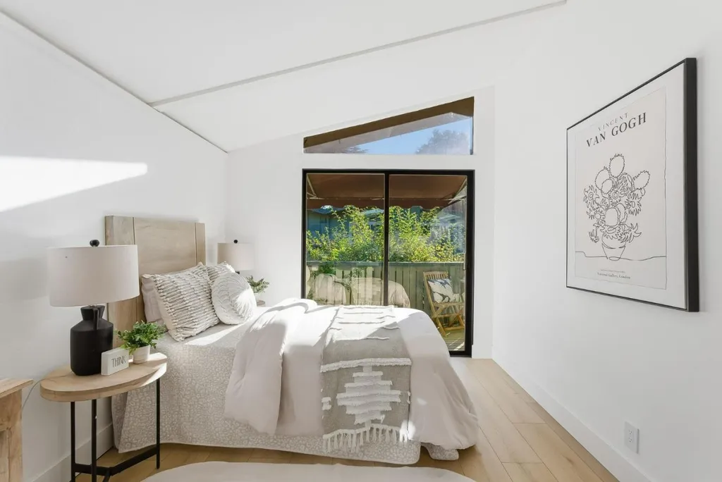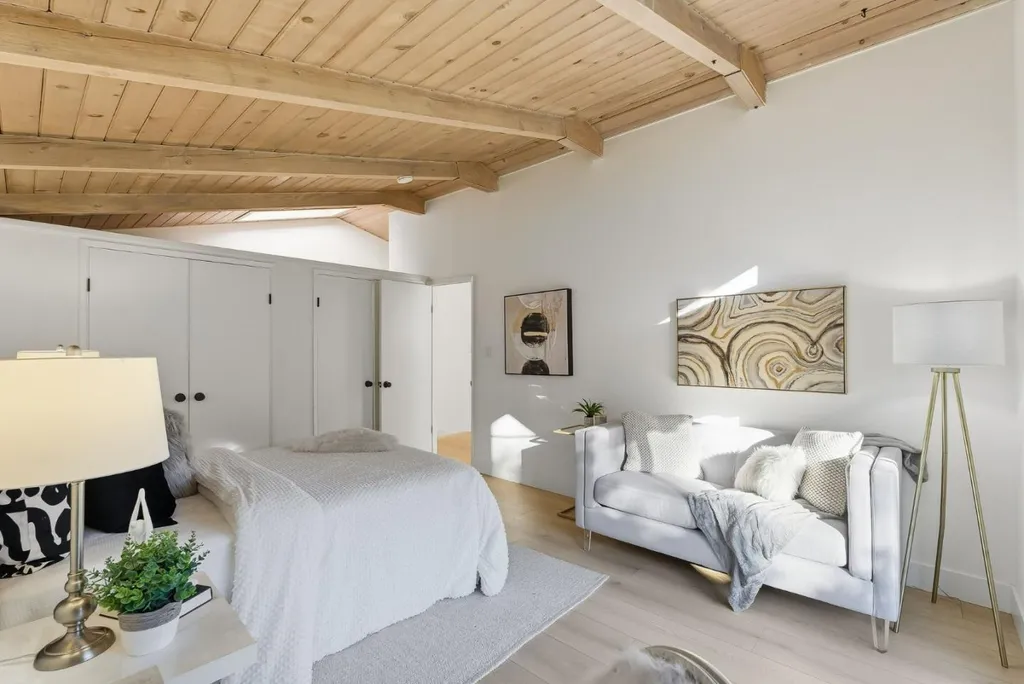 Beautifully remodeled townhome with 2 bedrooms, 1 bathroom, and access to outstanding Los Altos schools. This home features an open-concept design with natural wood beam ceilings and new wide-plank flooring throughout. The fully remodeled kitchen offers new cabinetry, stainless-steel appliances, and direct access to a private patio ideal for morning coffee or outdoor dining. Upstairs are two spacious bedrooms with vaulted ceilings and sliding glass doors opening to the balcony. The light-filled primary bedroom features two closets, including a walk-in. The remodeled bathroom enjoys a skylight, new flooring, a new bathtub, and a designer vanity. Community amenities include a pool, carport, and ample guest parking. Excellent, walkable location on the border of Palo Alto and Los Altos, with close proximity to shopping, dining, Caltrain, and major commute routes. Inside laundry may be added with HOA approval.