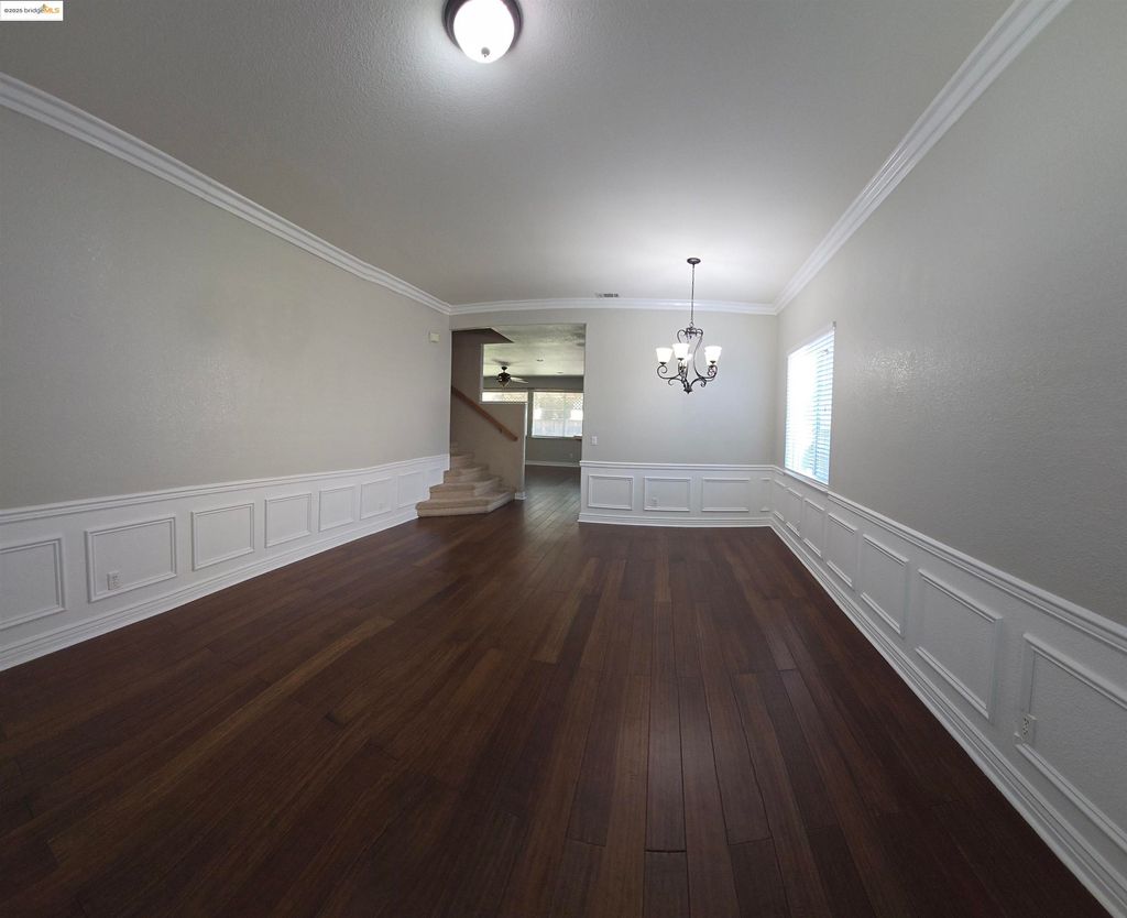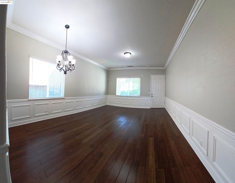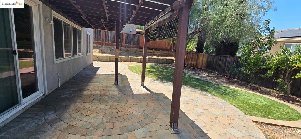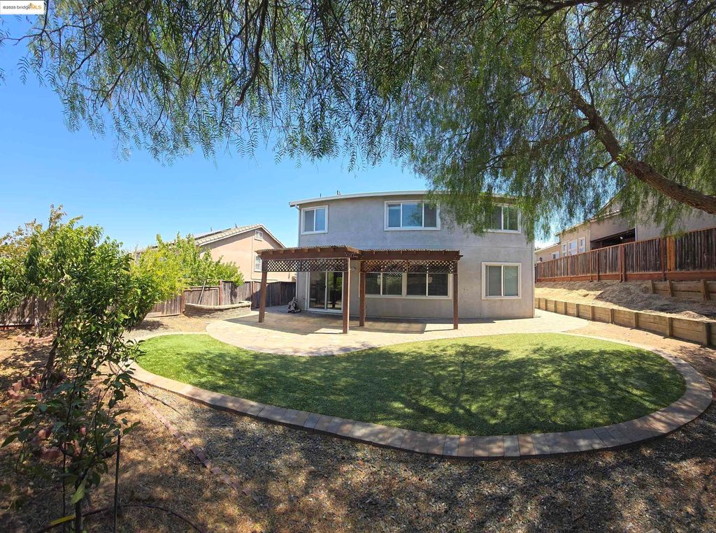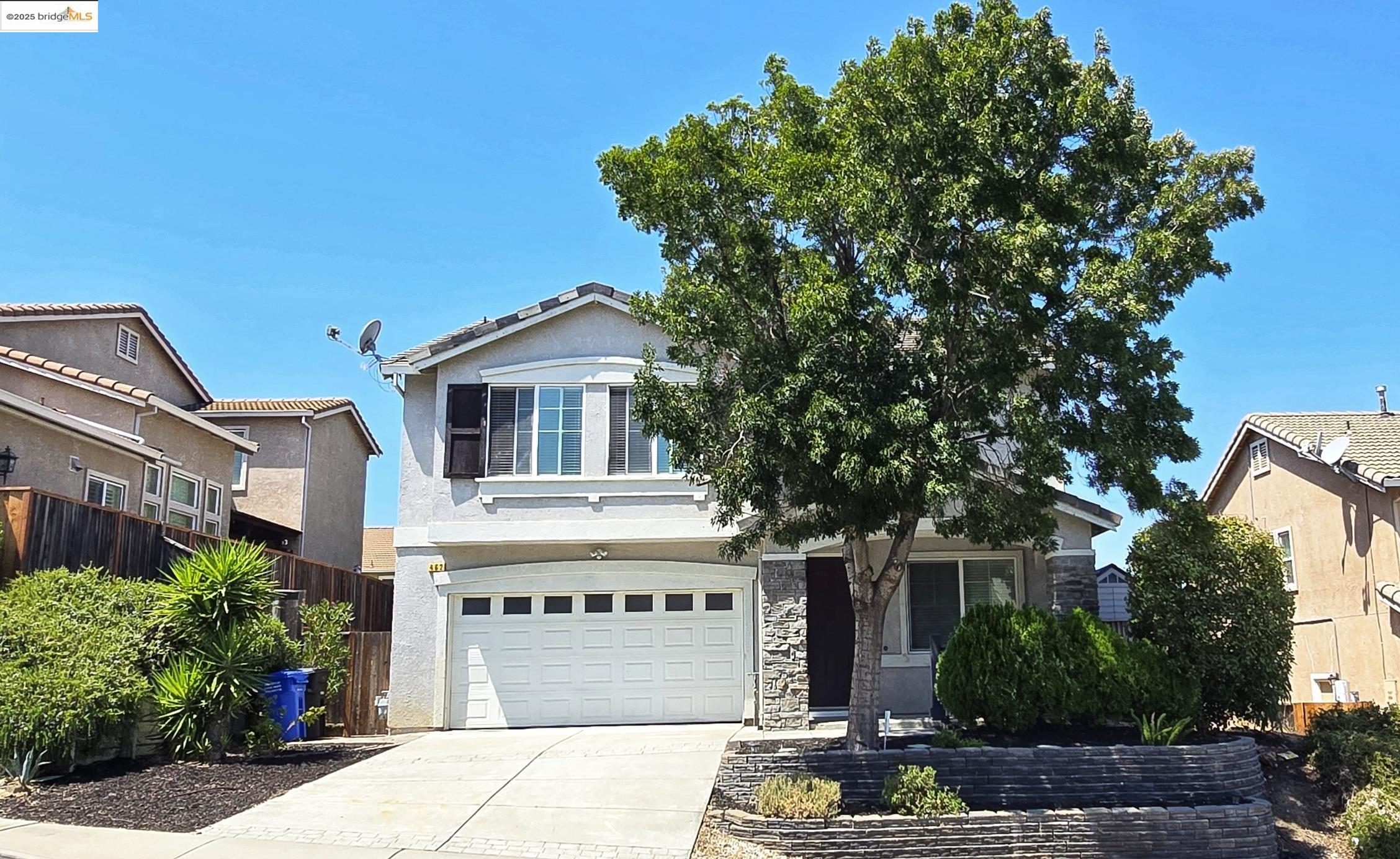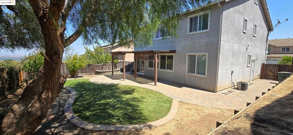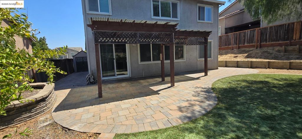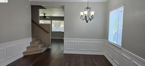 Step through the inviting covered porch into a spacious living room featuring classic raised-panel wainscoting, crown molding, and an adjacent formal dining area. The open-concept kitchen is a chef's delight, complete with a stylish island, pantry, stainless steel refrigerator, and modern finishes - perfect for entertaining. The family room, with its cozy gas fireplace, creates a warm gathering space for friends and family. The thoughtfully designed floor plan includes a guest bedroom and full bath on the main level - ideal for visitors or a home office. Downstairs showcases new, high-quality laminate flooring throughout, adding a sleek, modern touch. Upstairs, you'll find three additional bedrooms, including a versatile bonus room, and a serene primary suite with a private office nook, walk-in closet, and luxurious en-suite bath. A convenient upstairs laundry with a washer and dryer is also included. The backyard offers a great space for entertaining or weekend relaxation. Conveniently located near Bay Point BART, with easy freeway access and just minutes from shopping.